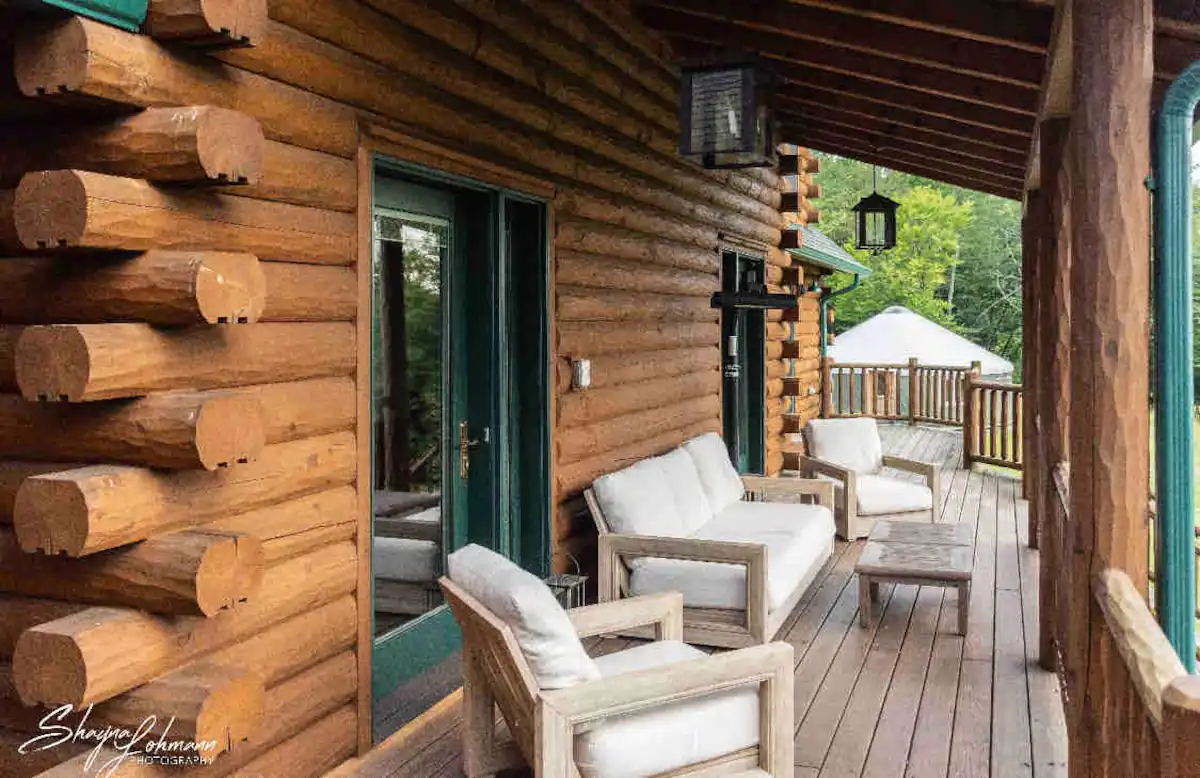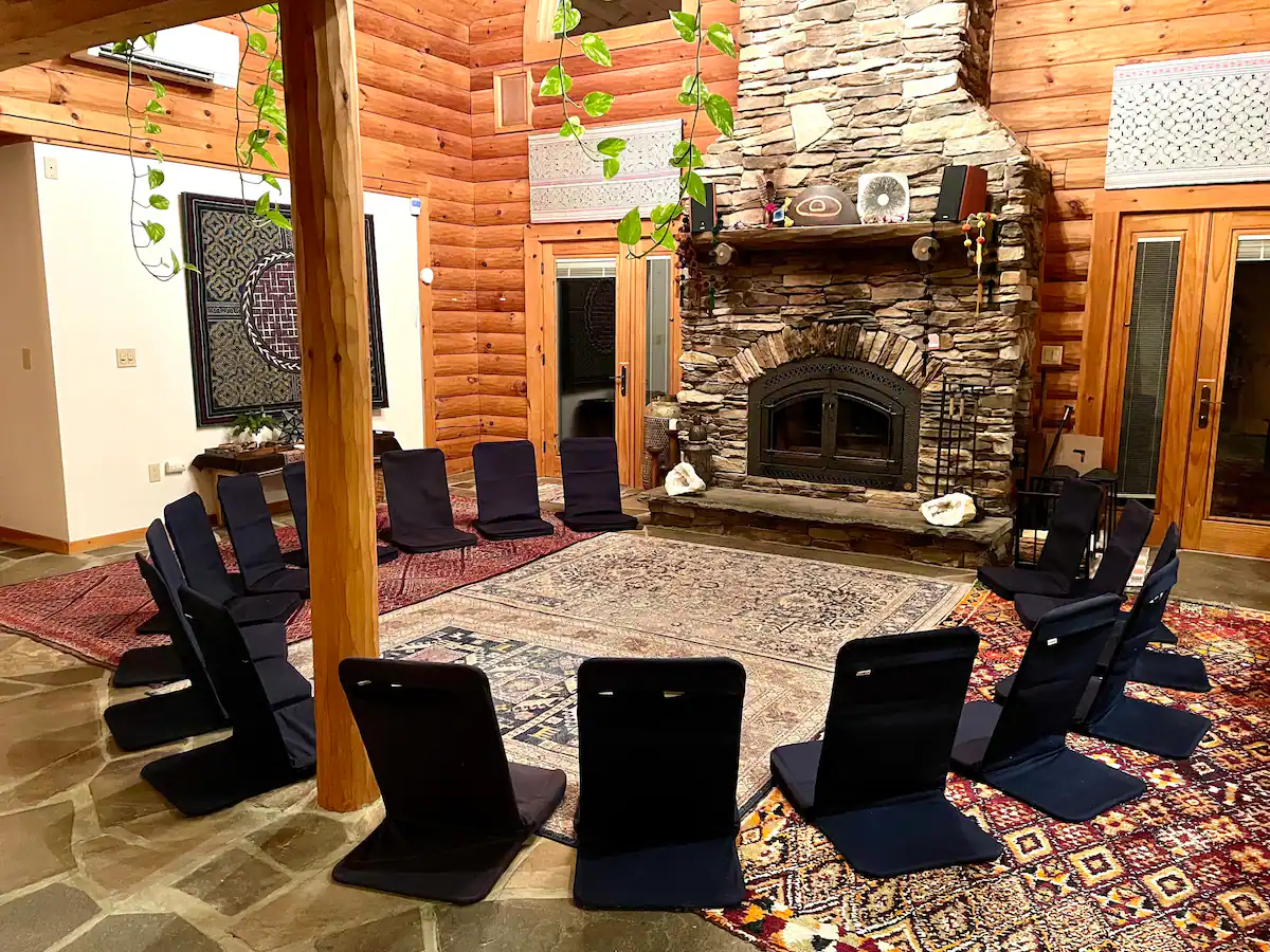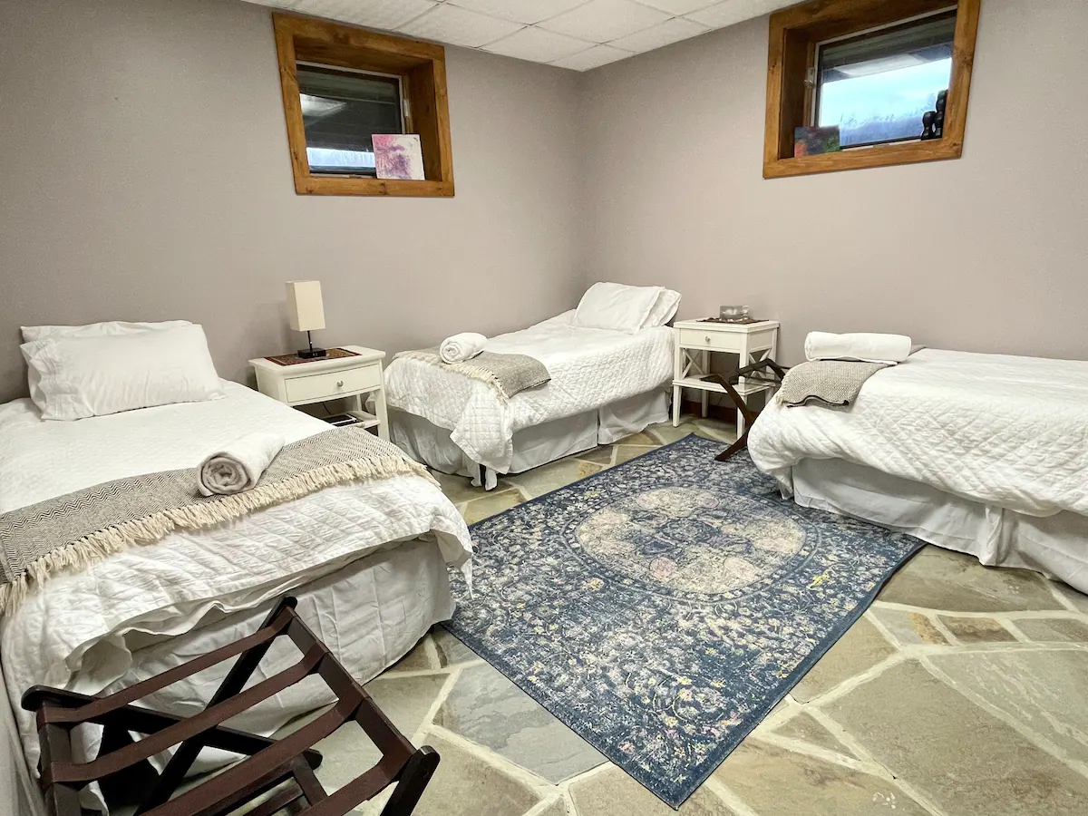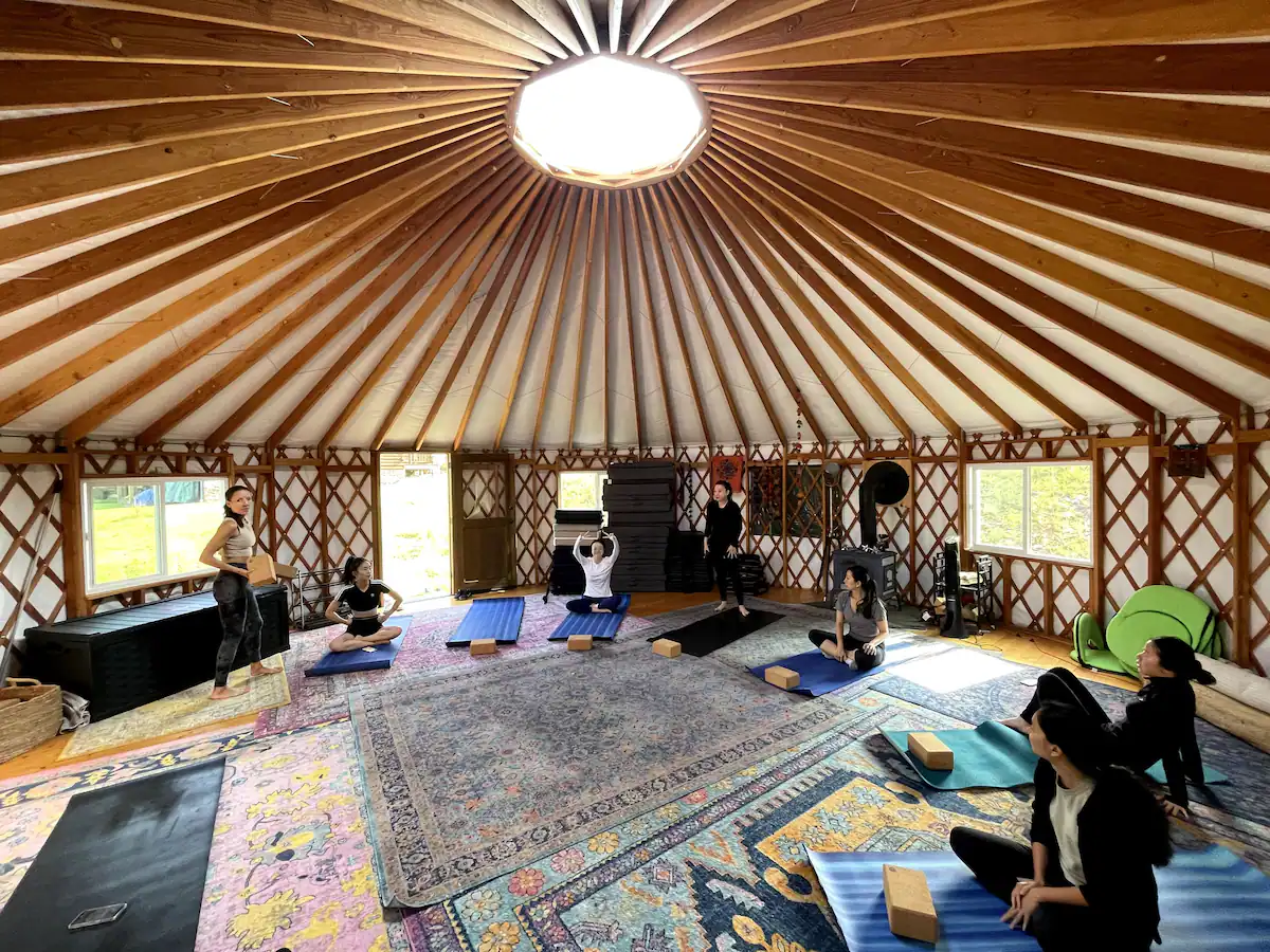 The main lodge is available year-round. With 8 bedrooms and 4.5 bathrooms, we have bed space for 24 adults. In the warmer months, we can accommodate an additional 12 adults in glamping tents with comfortable beds. We also have a 30-foot yurt, perfect for meditations, yoga, or conscious movement practices.