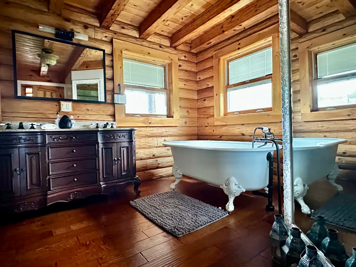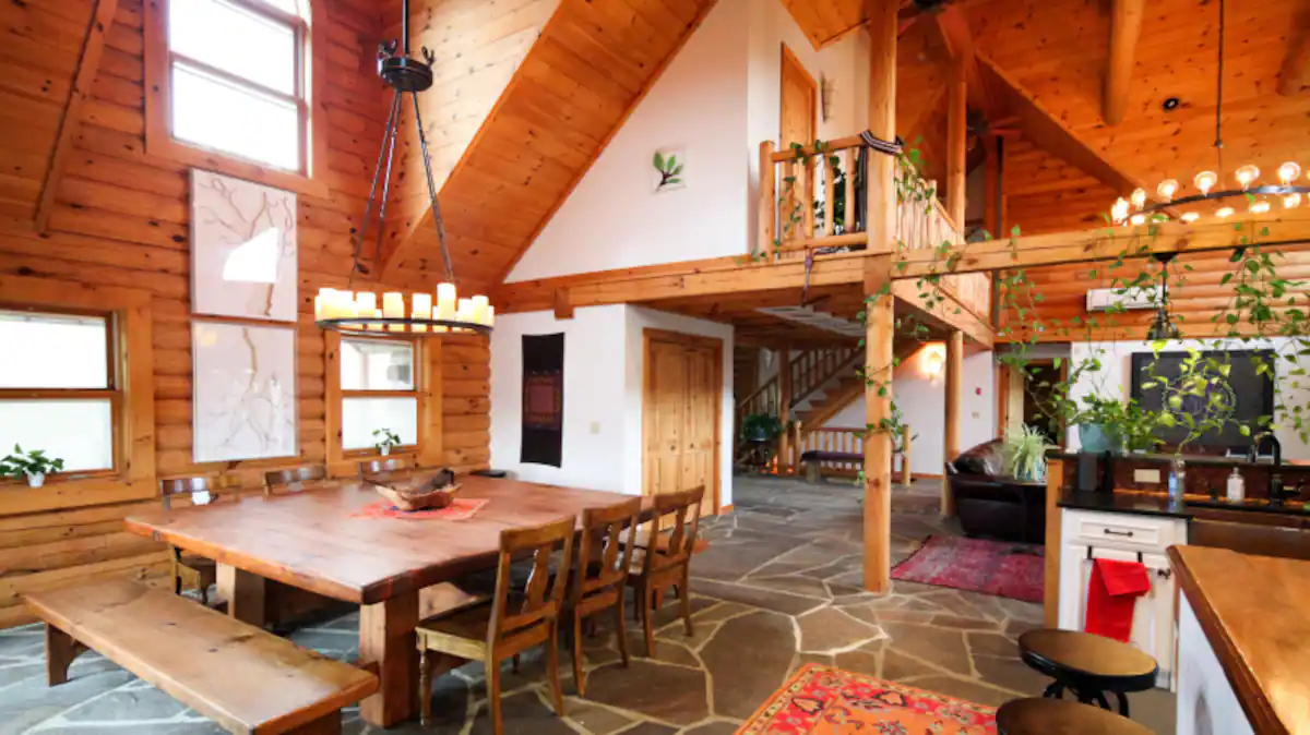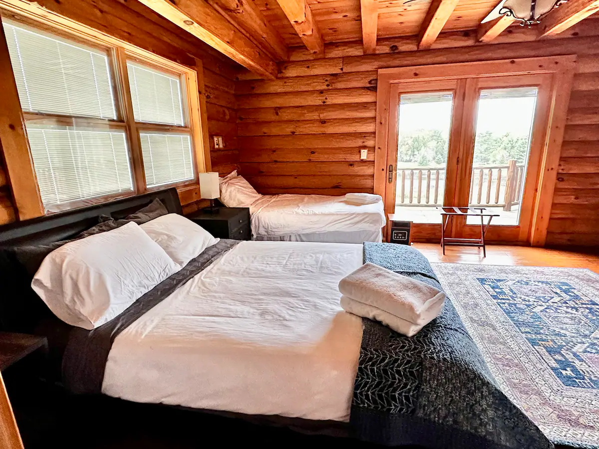 Our 8-bedroom log cabin is thoughtfully designed for groups and large families to gather and connect. The great room takes center stage with a large fireplace, open layout, soaring cathedral ceilings, and flexible seating that can be easily rearranged to accommodate different group activities. Our dining area’s enormous 8′ x 8′ dining table, handmade from trees that grew on the land, can easily fit 16, and is warmly lit by a dimmable chandelier.