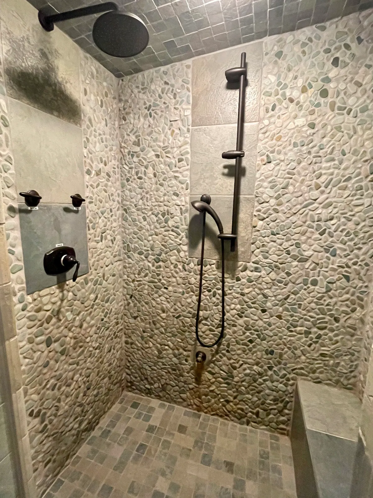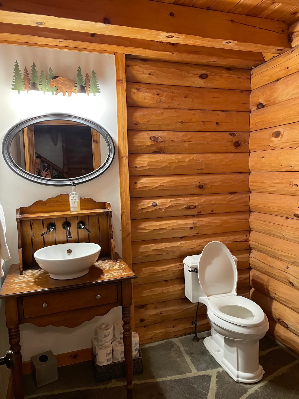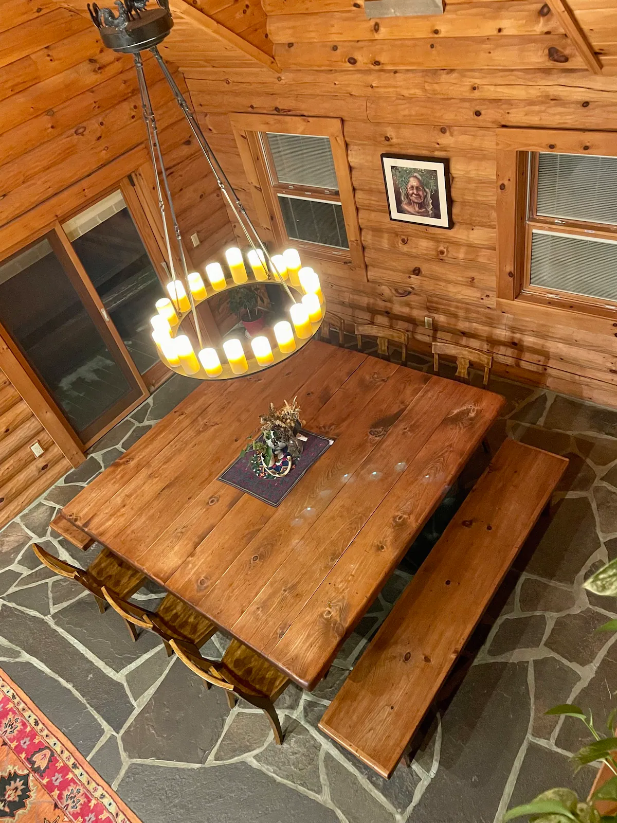 Our 8-bedroom log cabin is thoughtfully designed for groups and large families to gather and connect. The great room takes center stage with a large fireplace, open layout, soaring cathedral ceilings, and flexible seating that can be easily rearranged to accommodate different group activities. Our dining area’s enormous 8′ x 8′ dining table, handmade from trees that grew on the land, can easily fit 16, and is warmly lit by a dimmable chandelier.
