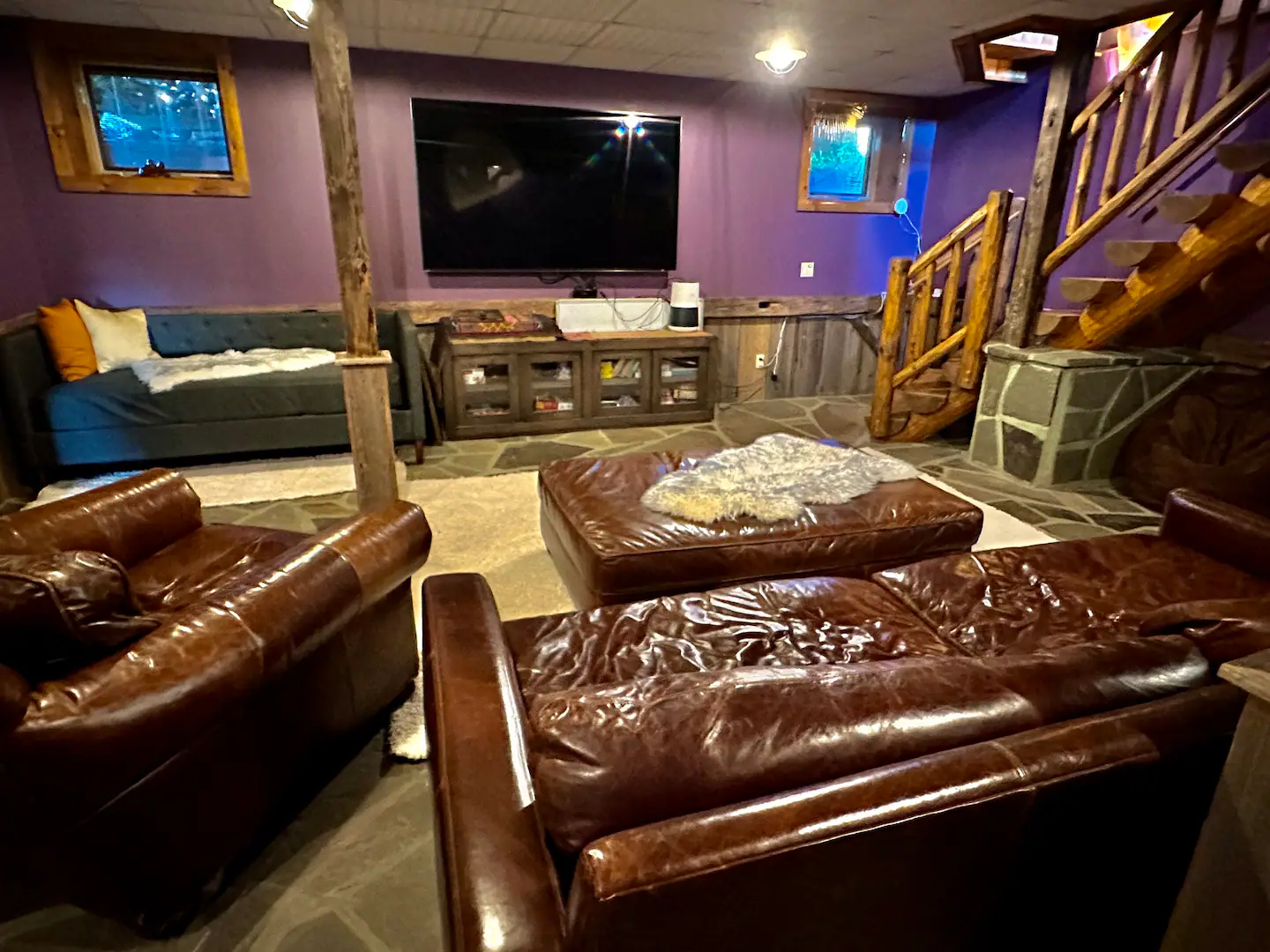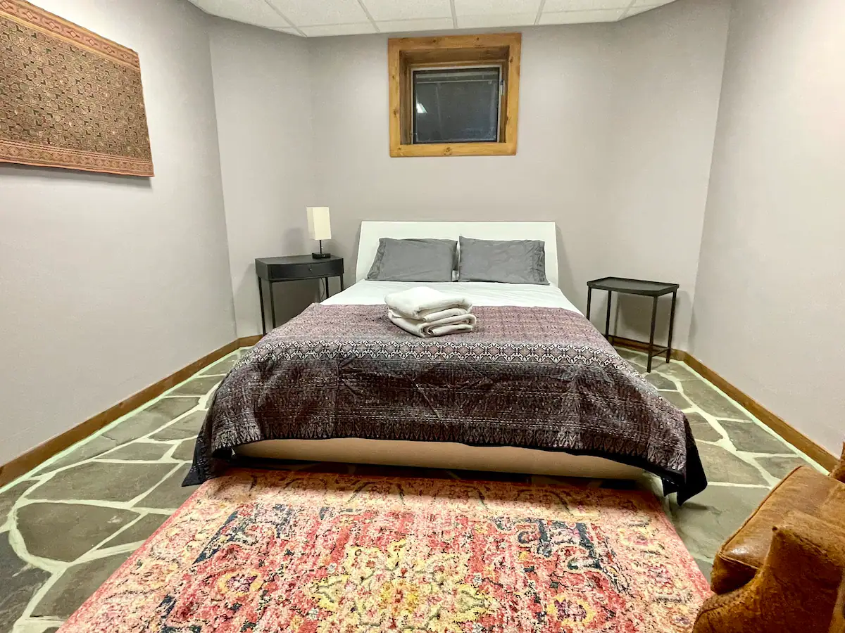 The fully finished basement features a family room with TV and board games, and two bathrooms. The sauna is a cozy space to unwind the body/mind after a day of exploring and playing outdoors.